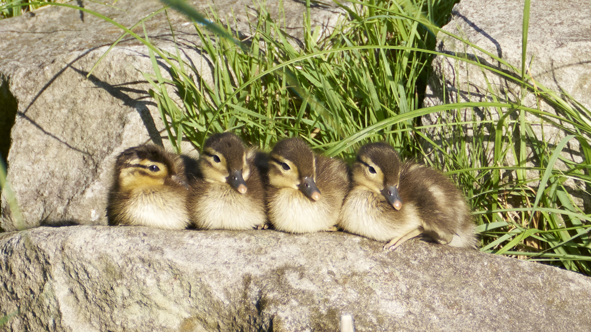 札幌中島公園でくつろぐオシドリのヒナ4羽です(2025年7月25日)。