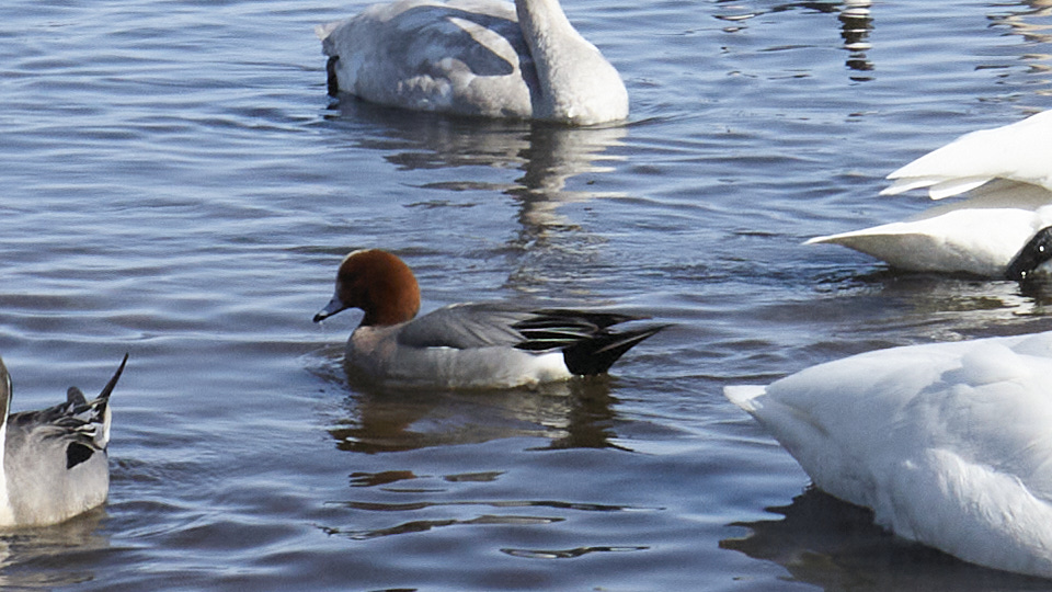 苫小牧市ウトナイ湖のとハクチョウとオナガガモの集団です(2009年3月8日)。ヒドリガモ(写真の中央下の頭が少し明るい茶色の鳥)もいます。