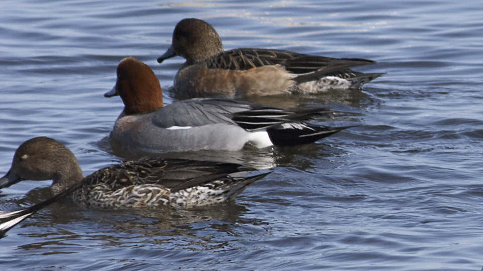 苫小牧市ウトナイ湖のヒドリガモです(2009年3月8日)。手前から、オナガガモのメス、ヒドリガモのオス、一番後ろがヒドリガモメスです。