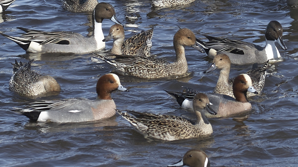 苫小牧市ウトナイ湖のオナガガモの集団の中にヒドリガモ(オス)2羽が混じっています(2009年3月8日)。左側の頭が薄茶色の2羽です。