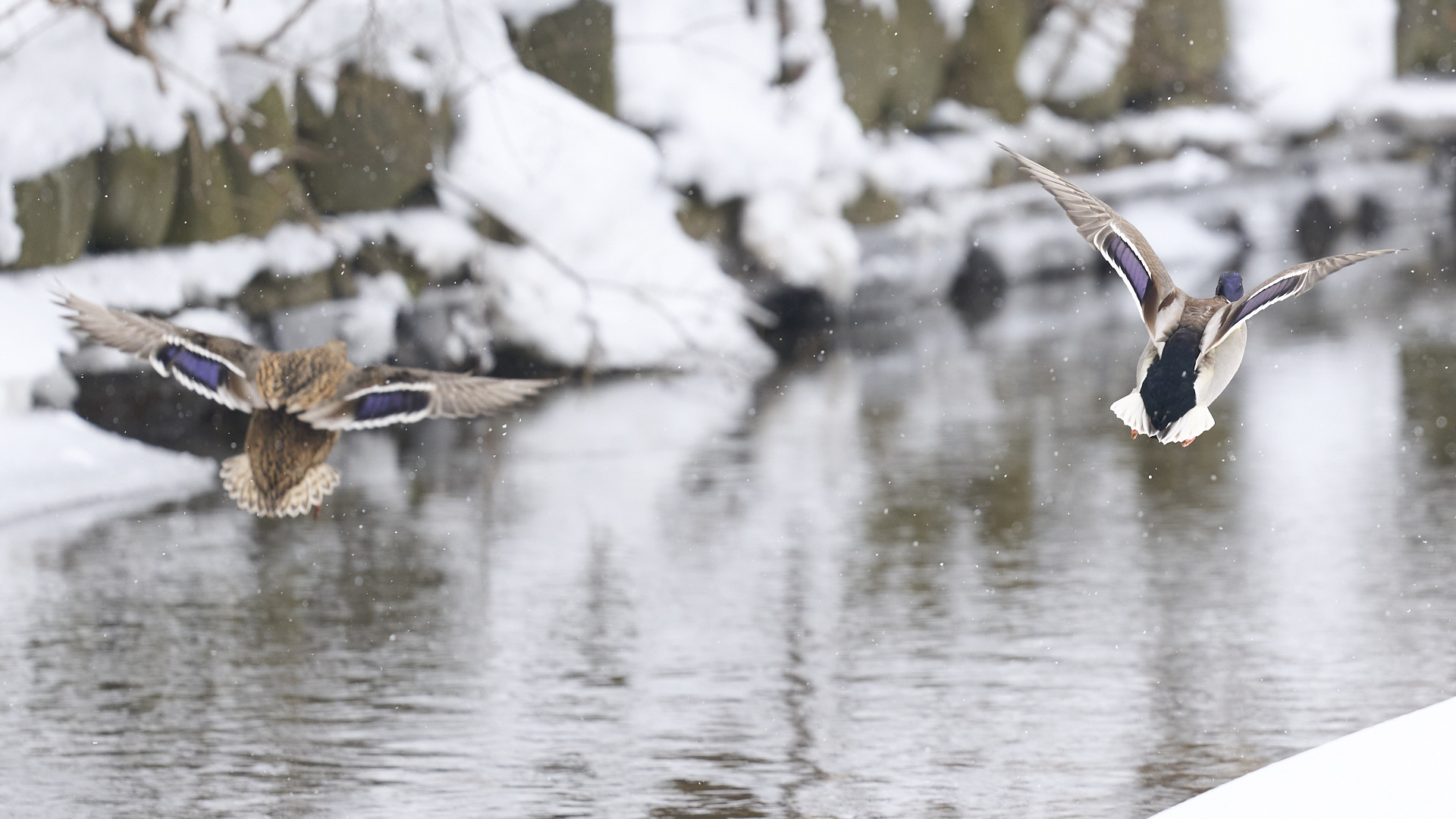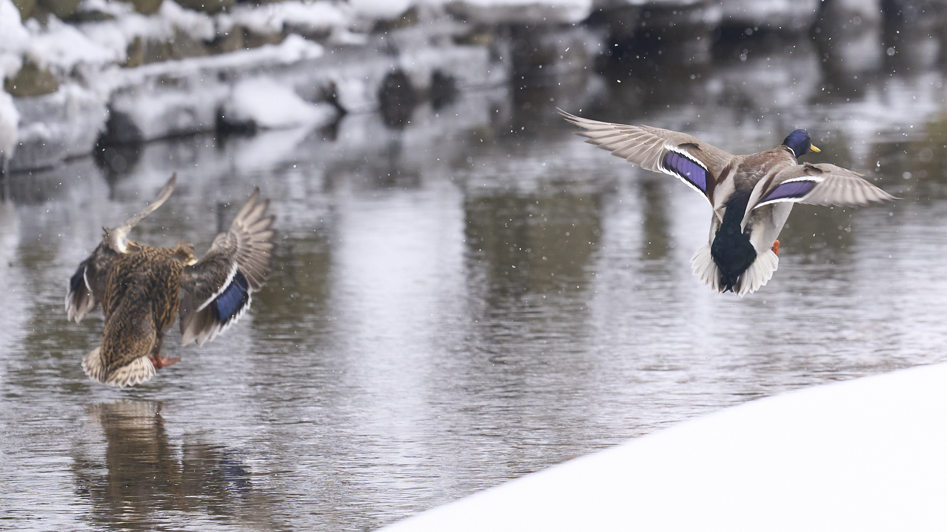 札幌の中島公園で飛ぶマガモを見掛けました(2020年12月13日撮影)。