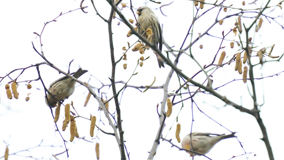 中島公園のベニヒワ3羽です(2025年11月24日)。10羽以上の集団でしばらく同じ木に留まっていました。