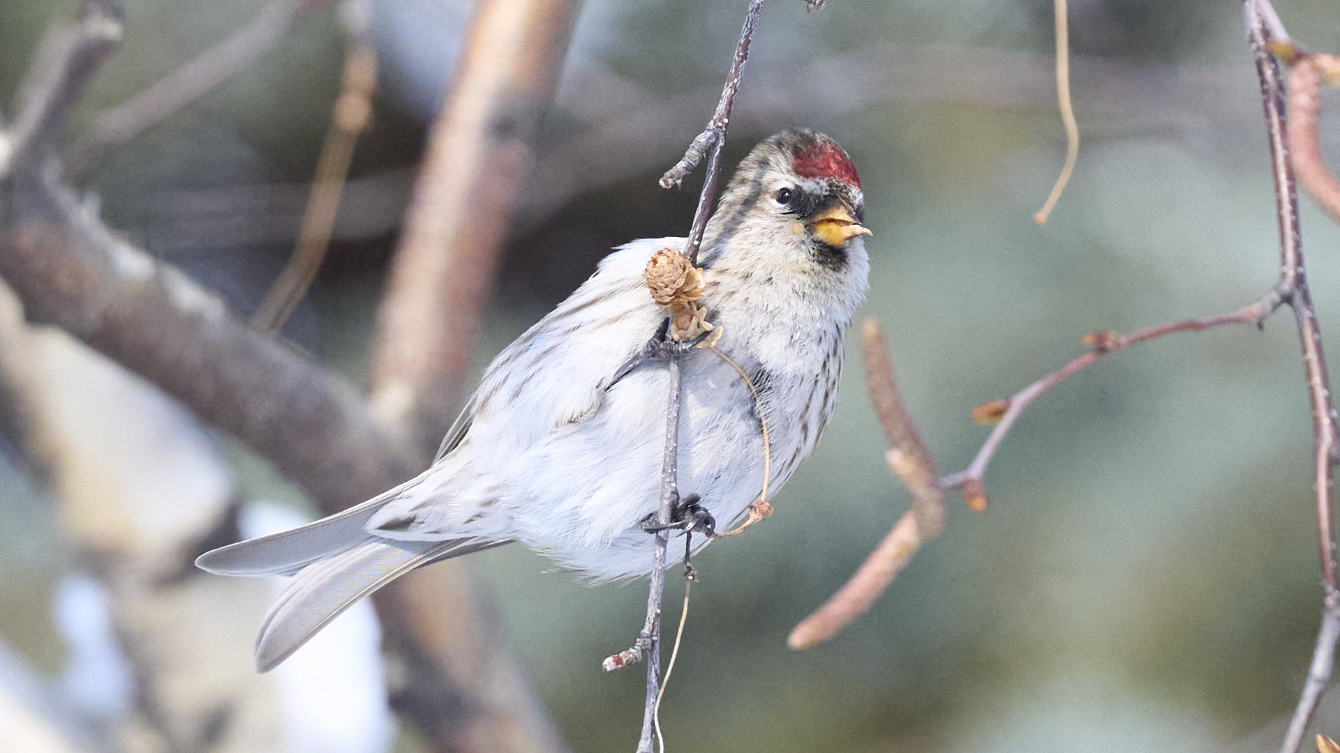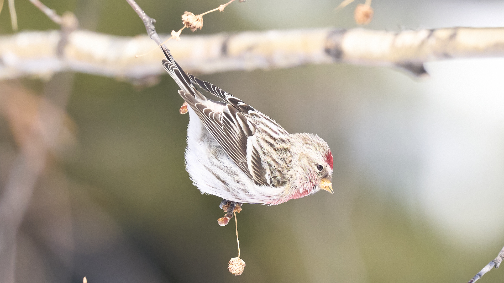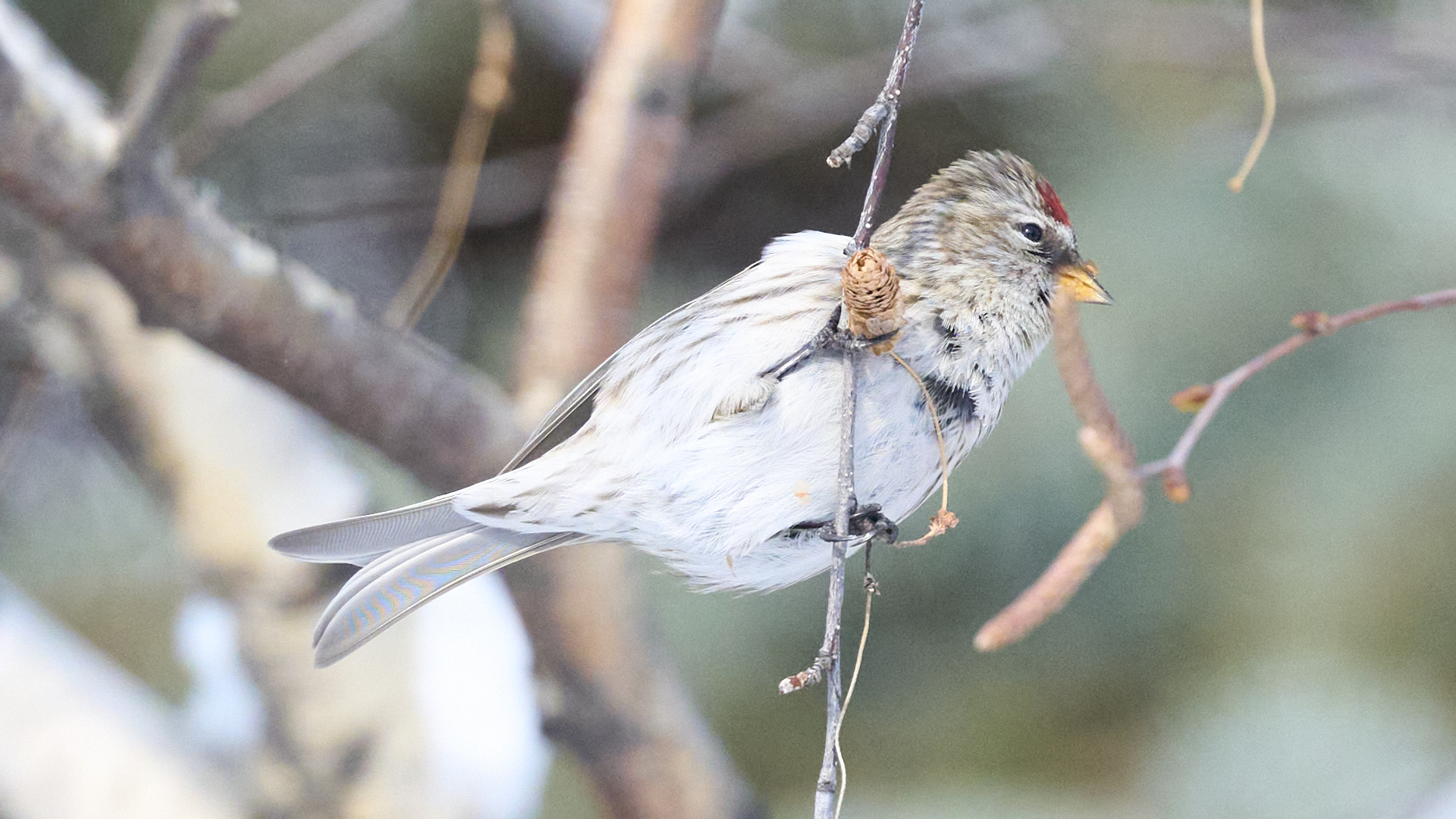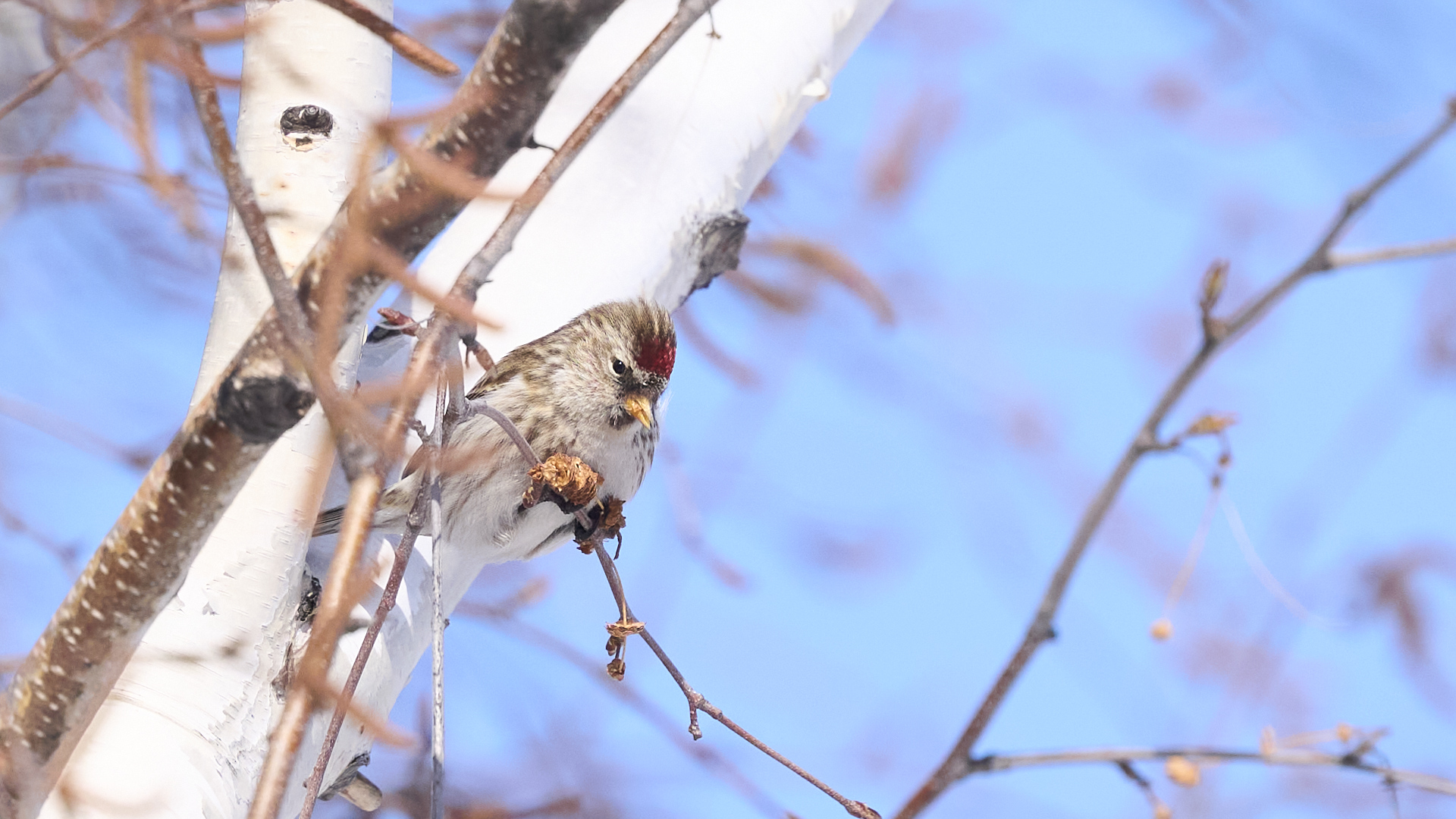 札幌市中島公園に現れたベニヒワのオスです(2026年2月10日)。人生2度目のベニヒワ撮影です。