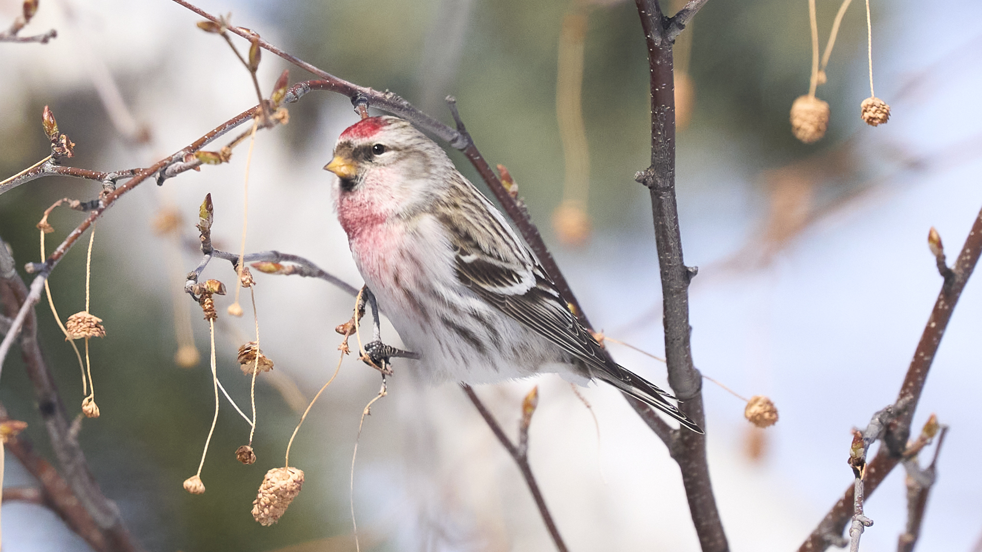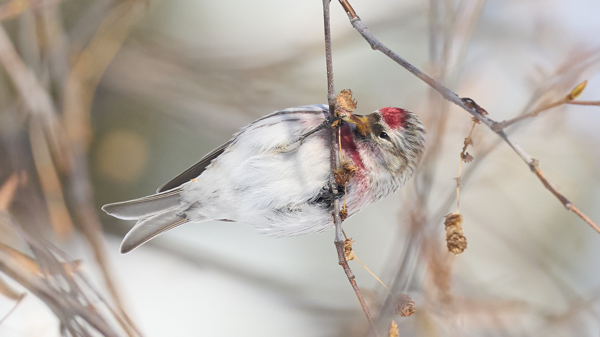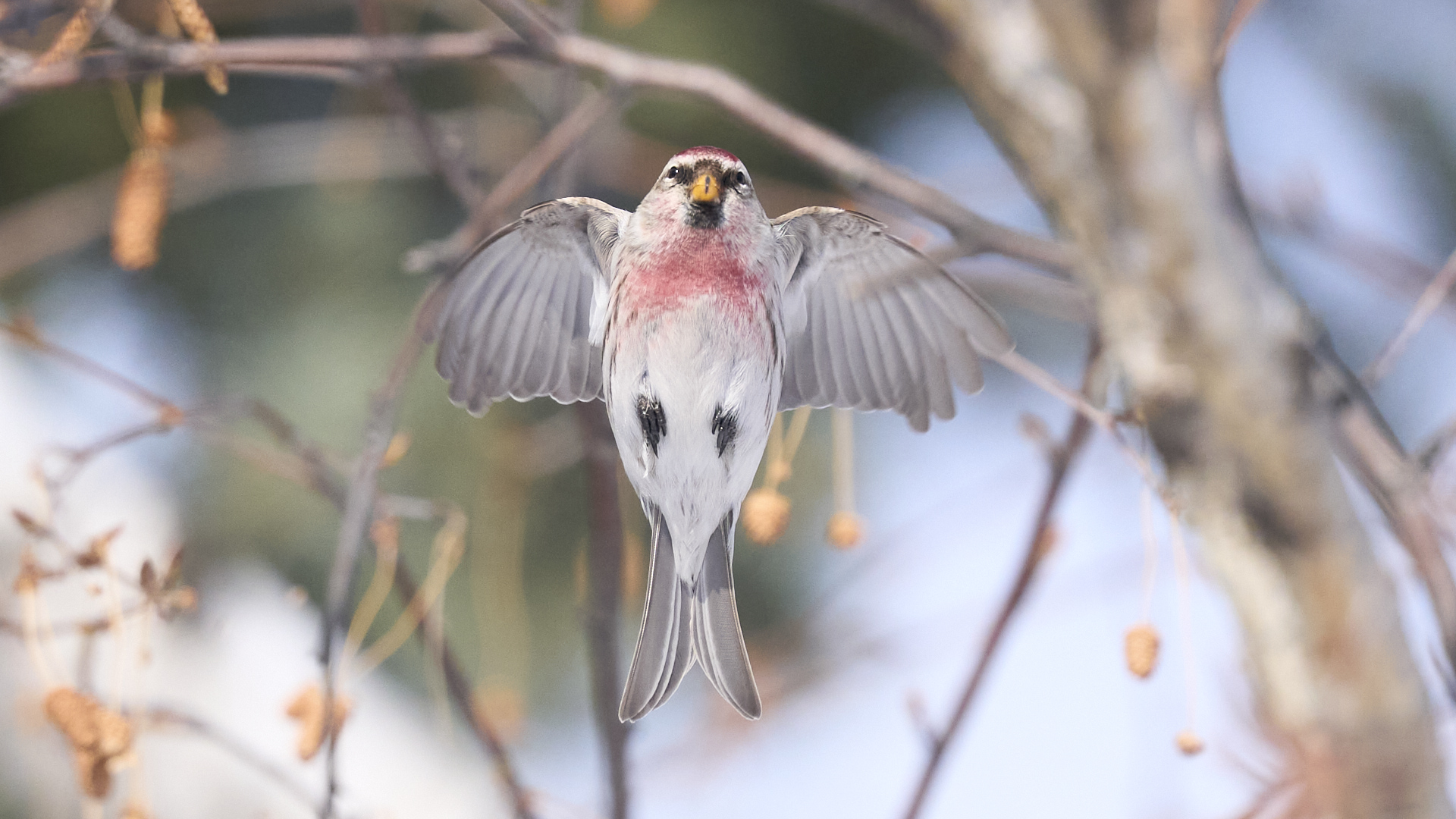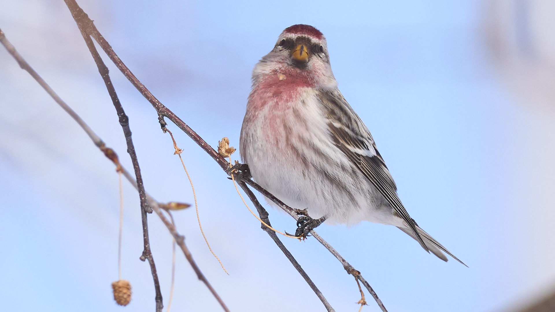 札幌市中島公園に現れたベニヒワのオスです(2026年2月10日)。人生2度目のベニヒワ撮影です。