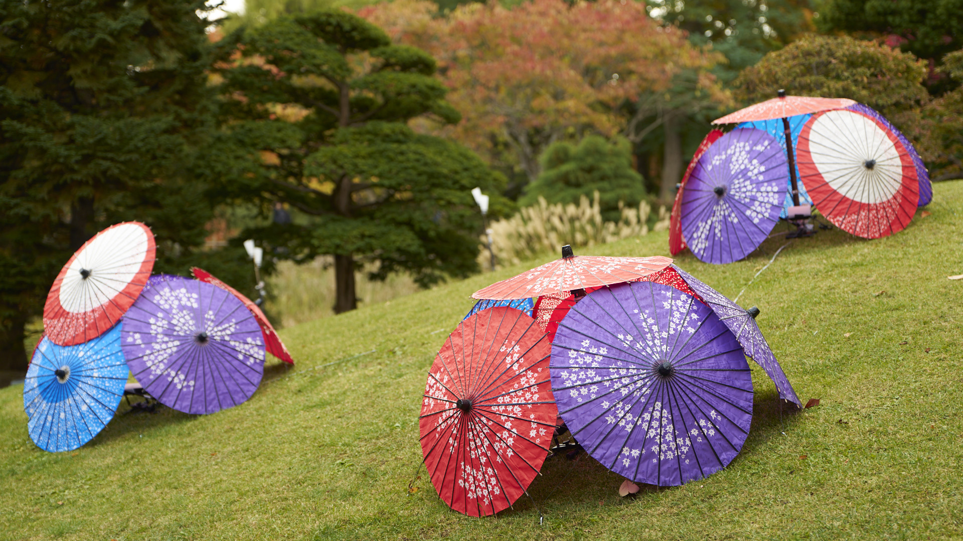 中島公園紅葉ライトアップ(10月24日〜11月3日)が開催されます。ライトアップに備え、日本庭園に設置さえた和傘です(2025年10月23日撮影)。