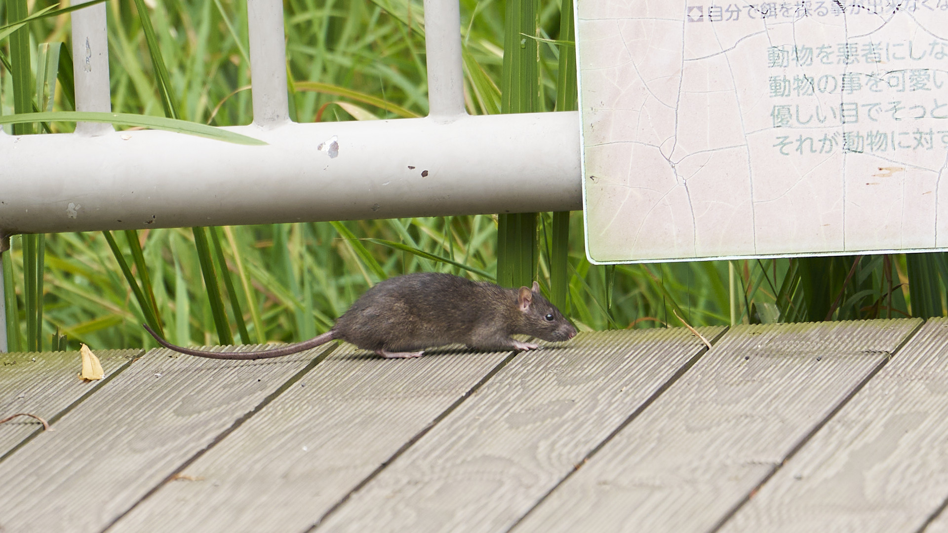 札幌中島公園の藤棚近くのデッキで見掛けたネズミです(2025年7月28日)。クマネズミの様です。
