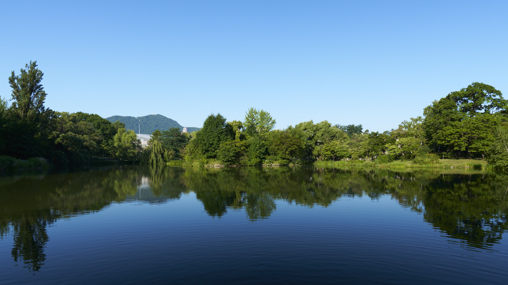 札幌中島公園 菖蒲池からの景色(2025年7月25日)。中央左側に見えるのは、藻岩山です。