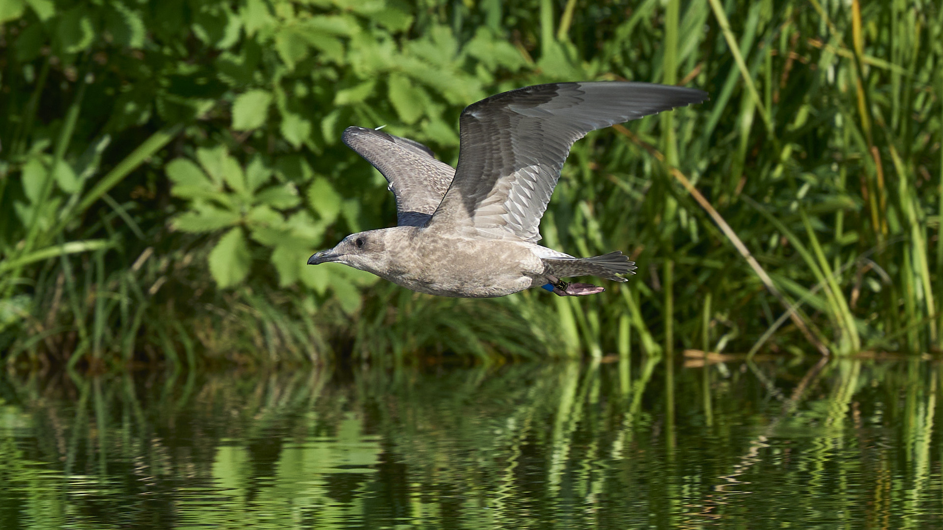 菖蒲池を飛行中のオオセグロカモメの幼鳥です(2025年9月16日)。