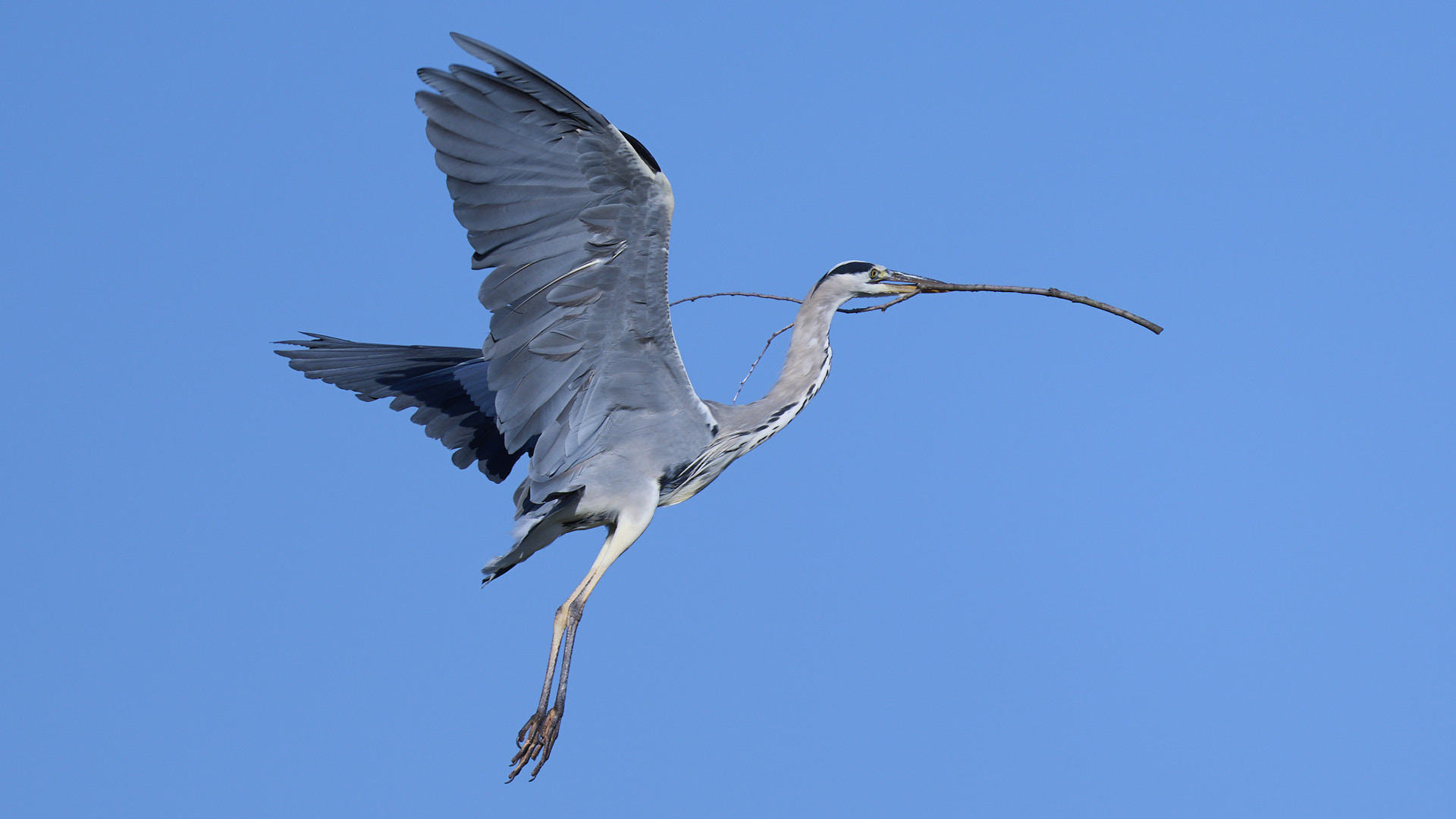 枝を咥えて飛行中のアオサギです(2025年9月16日)。