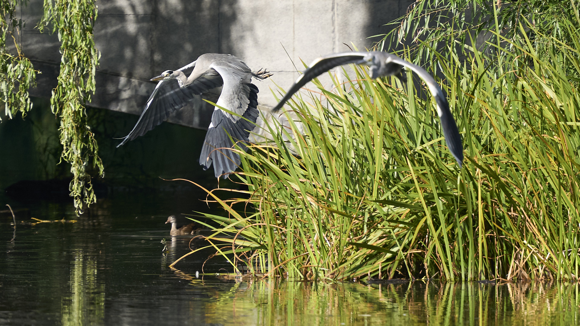 菖蒲池の茂みから飛び出してきた2羽のアオサギです(2025年9月16日)。
